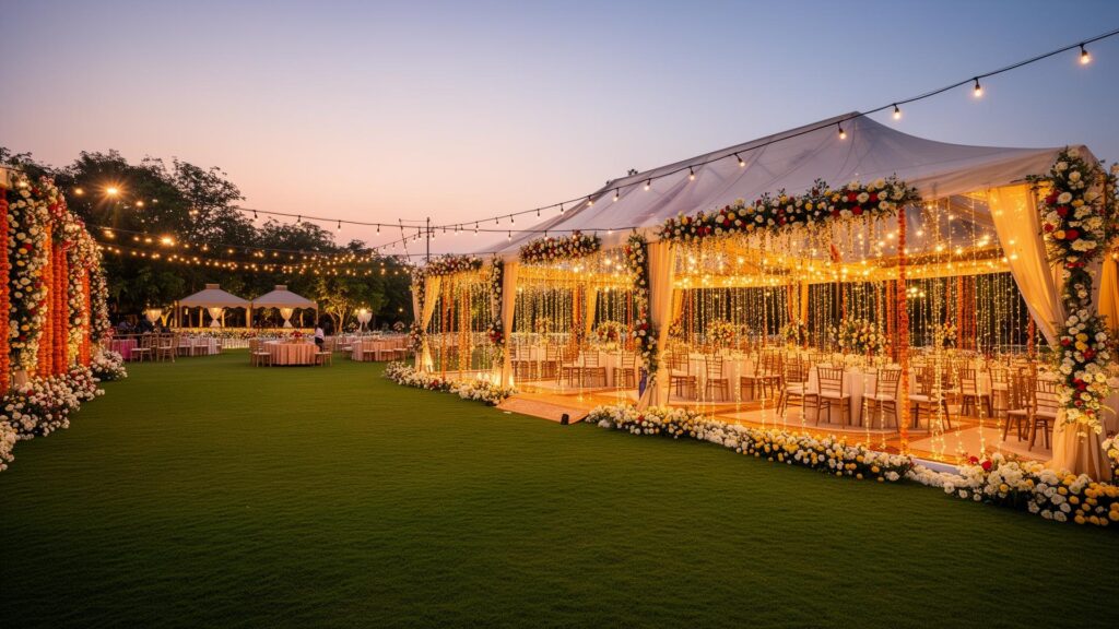 Elegant setup for wedding receptions with lighting, stage, and seating arrangements for large gatherings.
